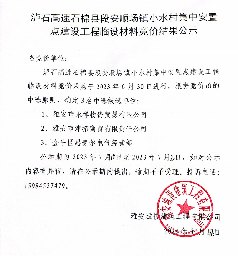 瀘石高速石棉縣段安順場鎮(zhèn)小水村集中安置點建設工程臨設材料競價結(jié)果公示