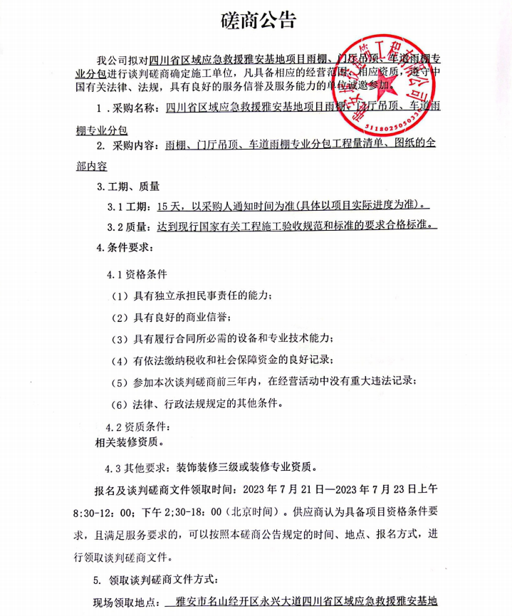 四川省區(qū)域應(yīng)急救援雅安基地項目雨棚、門廳吊頂、車道雨棚專業(yè)分包談判磋商公告