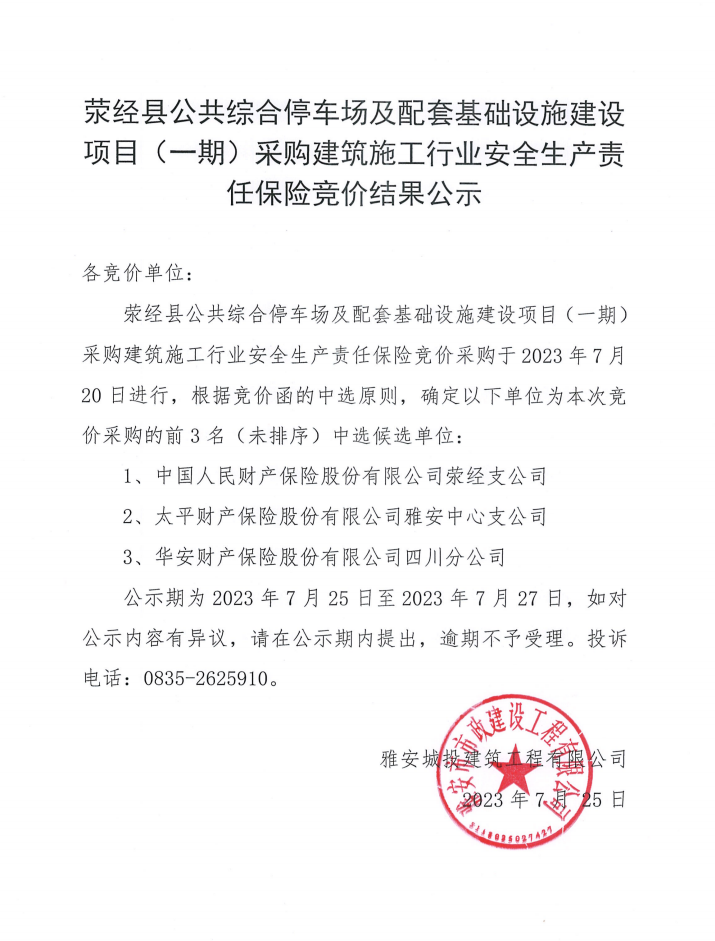 滎經(jīng)縣公共綜合停車場(chǎng)及配套基礎(chǔ)設(shè)施建設(shè)項(xiàng)目(一期)采購(gòu)建筑施工行業(yè)安全生產(chǎn)責(zé)任保險(xiǎn)競(jìng)價(jià)結(jié)果公示