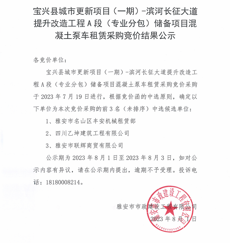寶興縣城市更新項(xiàng)目(一期)-濱河長(zhǎng)征大道提升改造工程A段(專業(yè)分包)儲(chǔ)備項(xiàng)目混凝土泵車租賃采購(gòu)競(jìng)價(jià)結(jié)果公示