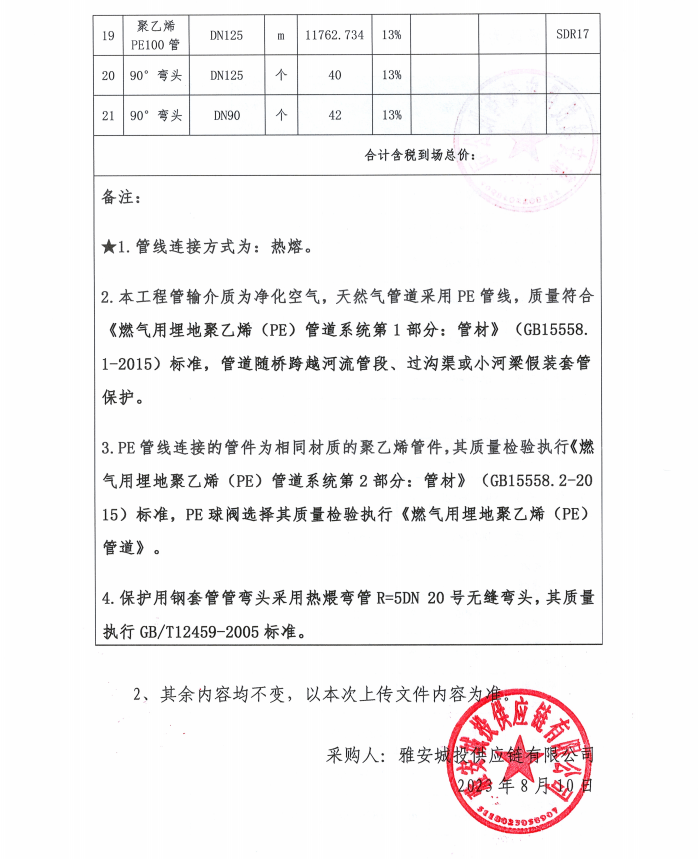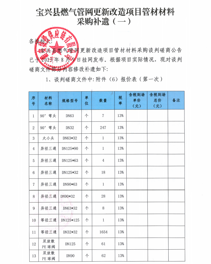 寶興縣燃?xì)夤芫W(wǎng)更新改造項(xiàng)目管材材料采購(gòu)補(bǔ)遺(一)