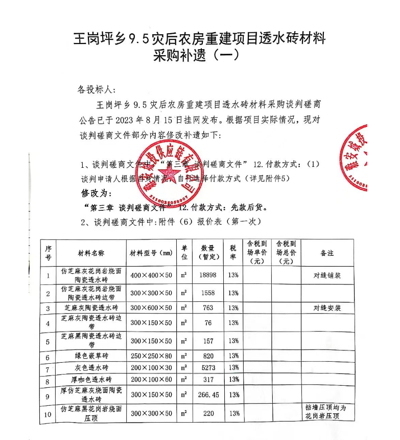 王崗坪鄉(xiāng)9.5災(zāi)后農(nóng)房重建項(xiàng)目透水磚材料采購補(bǔ)遺(一)