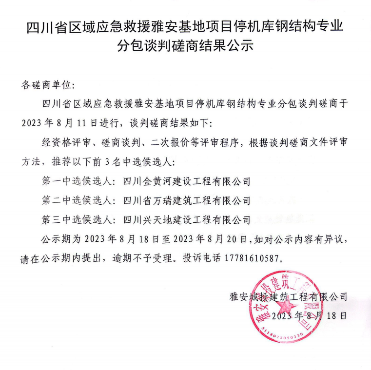 四川省區(qū)域應(yīng)急救援雅安基地項(xiàng)目停機(jī)庫(kù)鋼結(jié)構(gòu)專(zhuān)業(yè)分包談判磋商結(jié)果公示