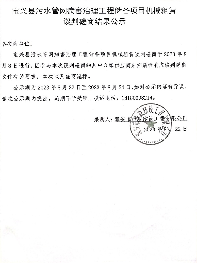 寶興縣污水管網(wǎng)病害治理工程儲備項目機械租賃談判磋商結(jié)果公示
