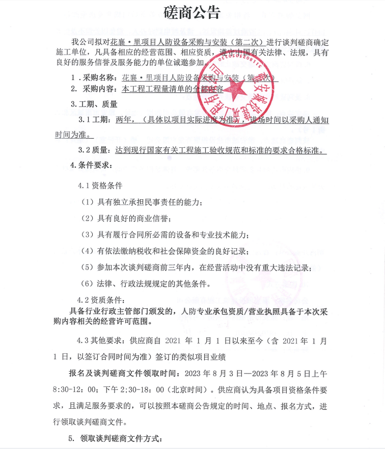 花襄·里項(xiàng)目人防設(shè)備采購與安裝(第二次)談判磋商公告