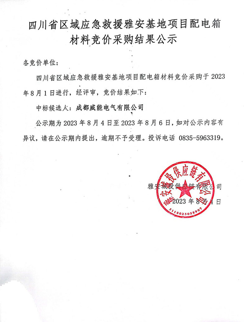 四川省區(qū)域應急救援雅安基地項目配電箱材料競價采購結果公示