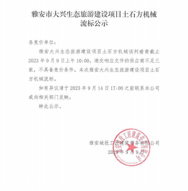 雅安市大興生態(tài)旅游建設項目土石方機械流標公示