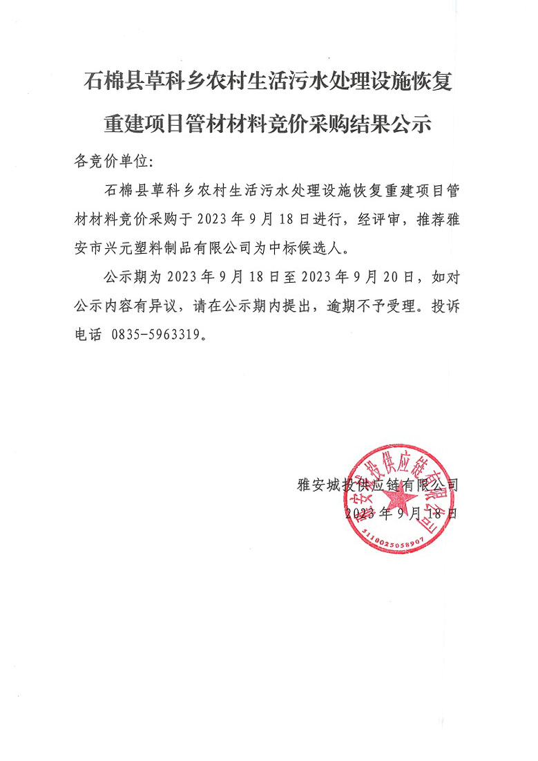 石棉縣草科鄉(xiāng)農(nóng)村生活污水處理設(shè)施恢復(fù)重建項(xiàng)目管材材料競價(jià)采購結(jié)果公示