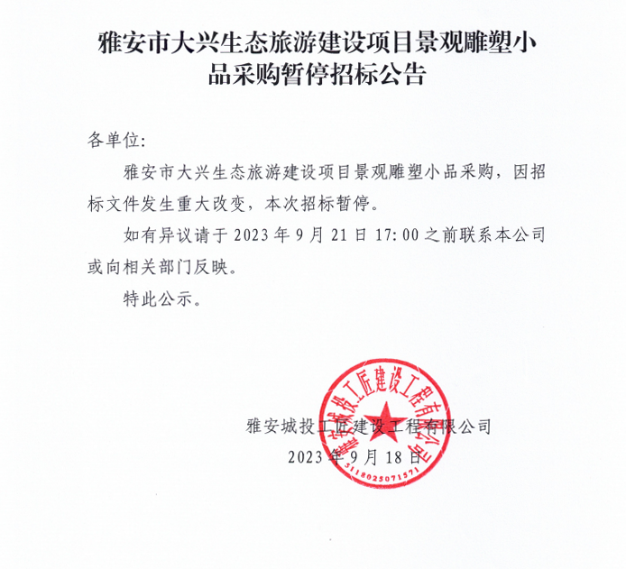 雅安市大興生態(tài)旅游建設(shè)項目景觀雕塑小品采購暫停招標(biāo)公告