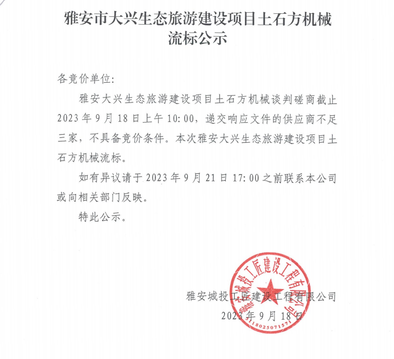 雅安市大興生態(tài)旅游建設(shè)項目土石方機械流標(biāo)公示