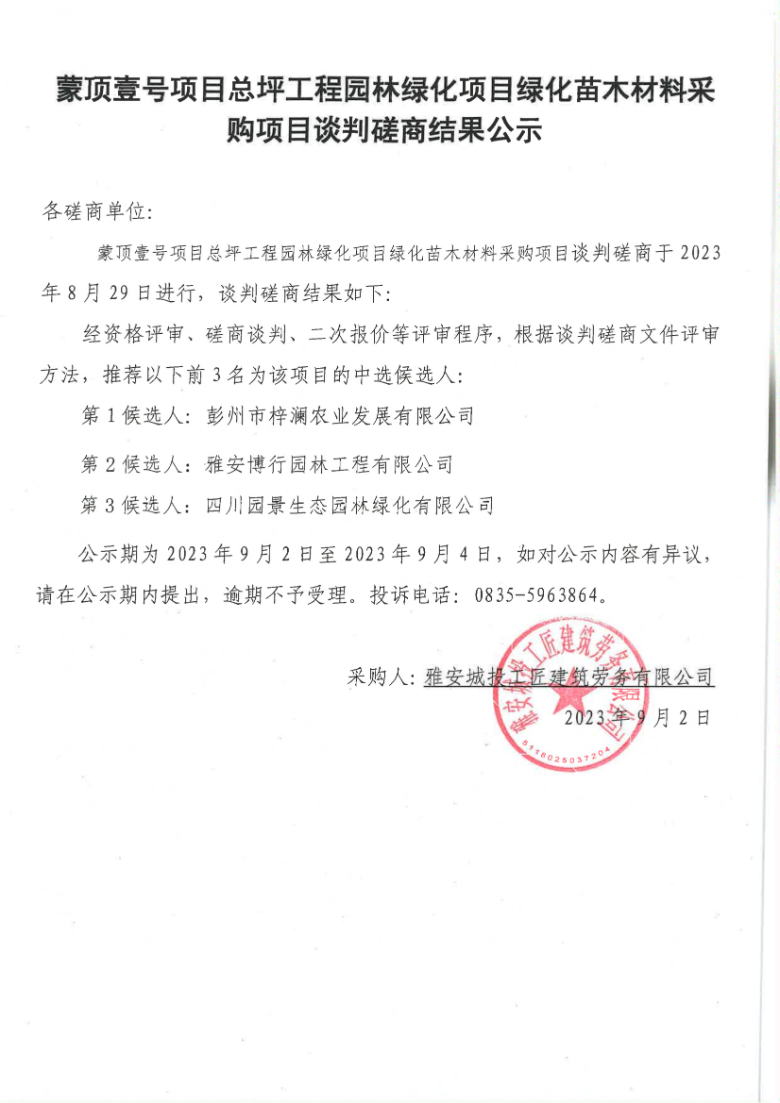 蒙頂壹號項目總坪工程園林綠化項目綠化苗木材料采購項目談判磋商結果公示