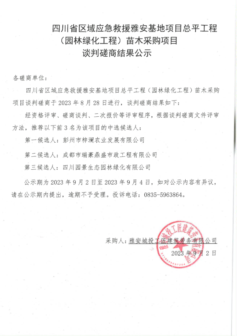 四川省區(qū)域應(yīng)急救援雅安基地項目總平工程(園林綠化工程)苗木采購項目談判磋商結(jié)果公示