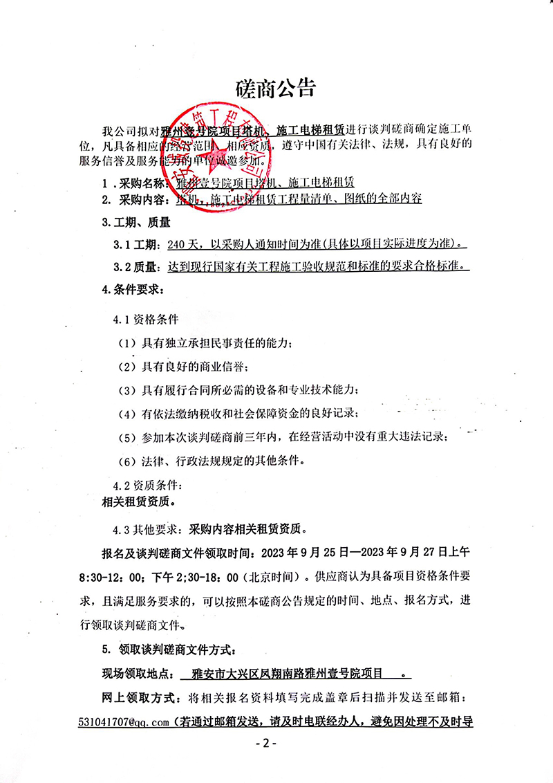 雅州壹號項目塔機(jī)、施工電梯租賃磋商公告