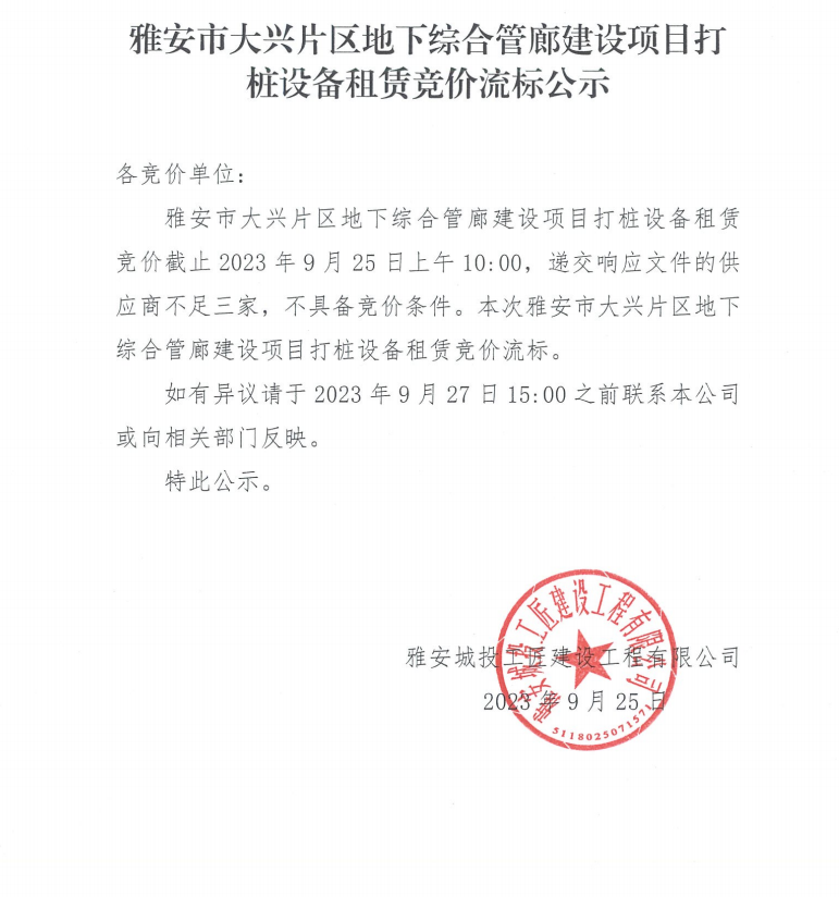 雅安市大興片區(qū)地下綜合管廊建設(shè)項目打樁設(shè)備租賃競價流標公示