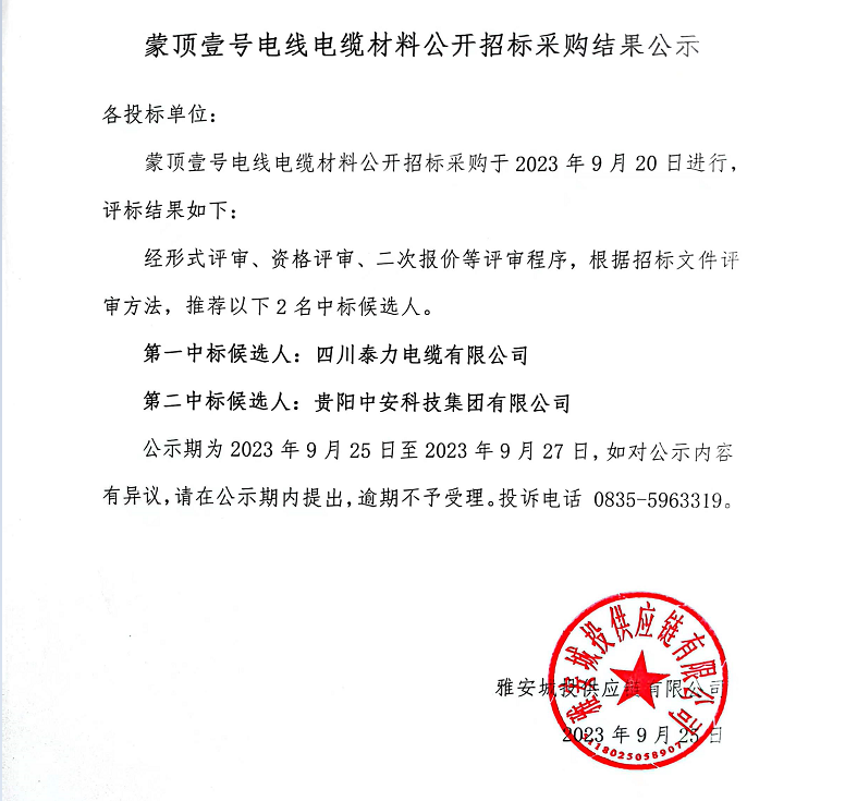 蒙頂壹號(hào)電線電纜材料公開招標(biāo)采購結(jié)果公示