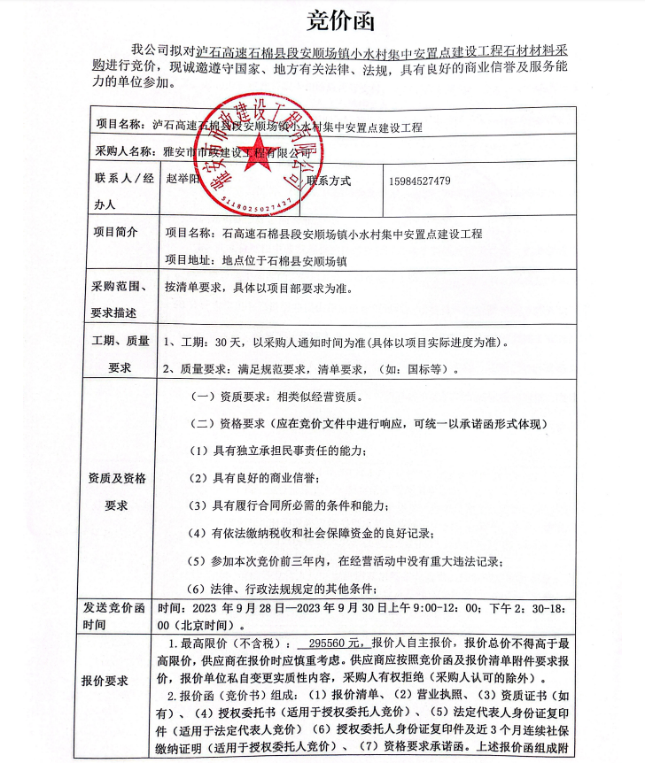 瀘石高速石棉縣段安順場小水村集中安置點建設(shè)工程石材材料采購競價公告