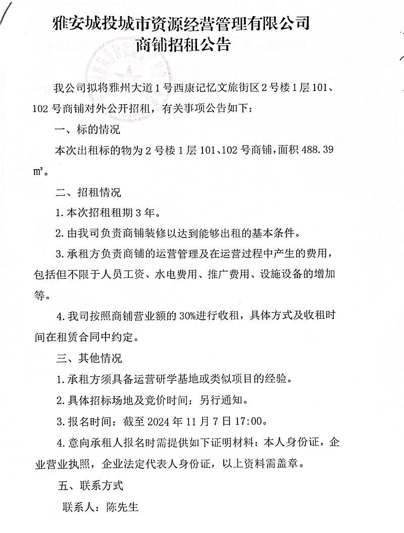 雅安城投城市資源經(jīng)營管理有限公司雅州大道1號西康記憶文旅街區(qū)2號樓1層101、102號商鋪招租的公告