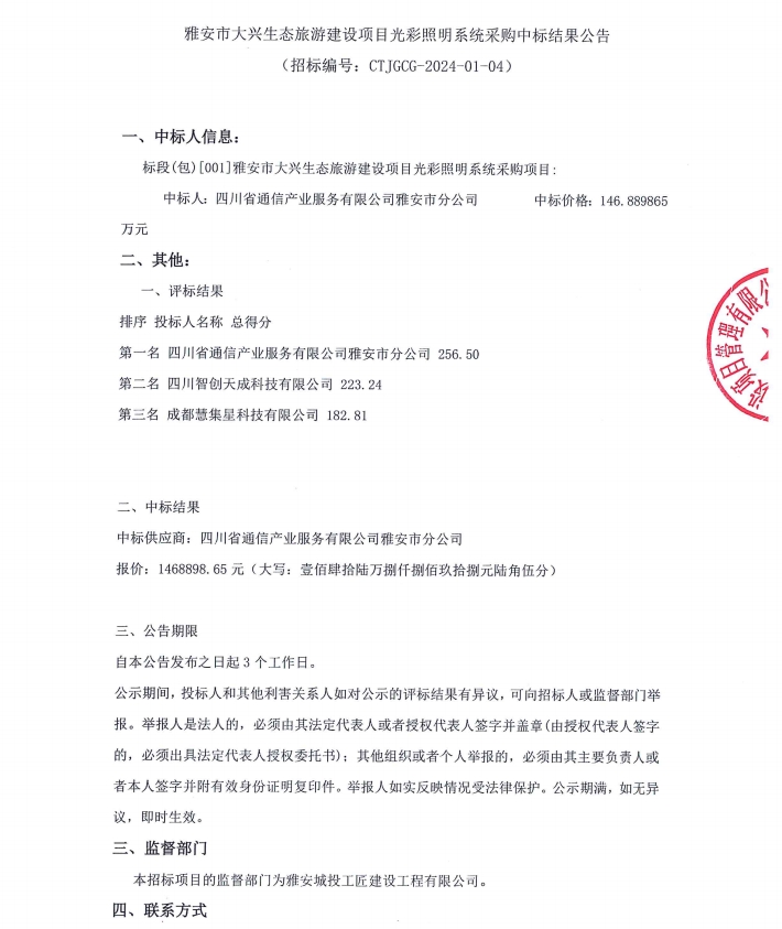雅安市大興生態(tài)旅游建設(shè)項目光彩照明系統(tǒng)采購中標(biāo)結(jié)果公告