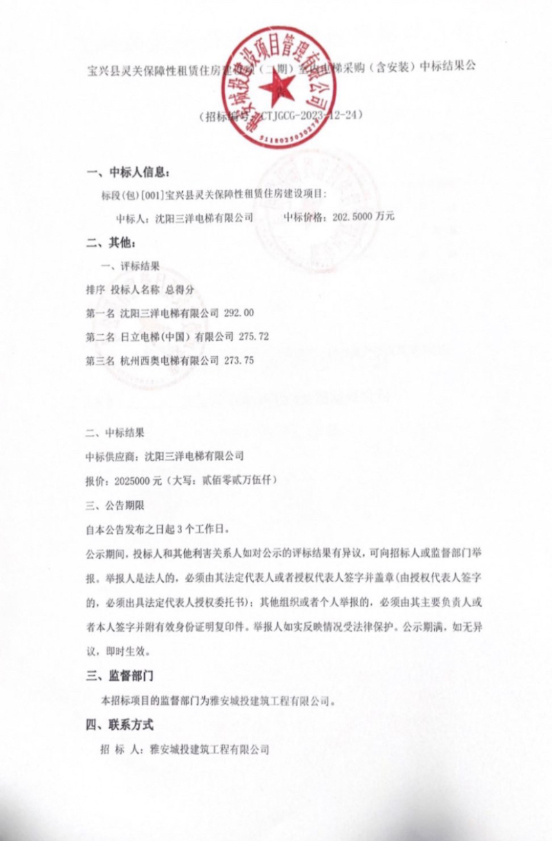 寶興縣靈關(guān)保障性租賃住房建設(shè)項目(二期)室內(nèi)電梯采購(含安裝)中標結(jié)果公示