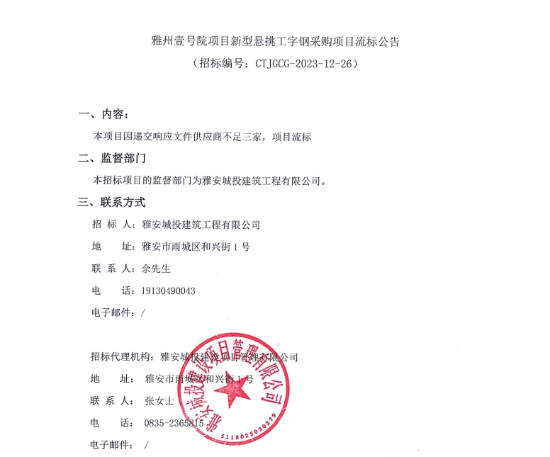 雅州壹號院項目新型懸挑工字鋼采購項目流標公告