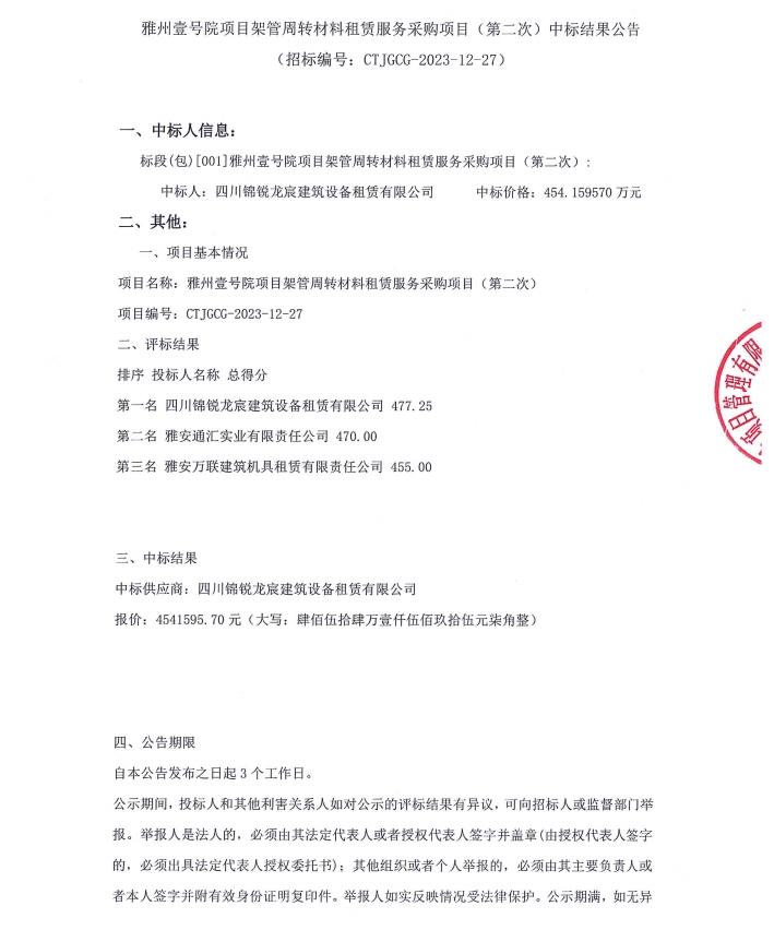 雅州壹號院項目架管周轉材料租賃服務采購項目(第二次)中標結果公告
