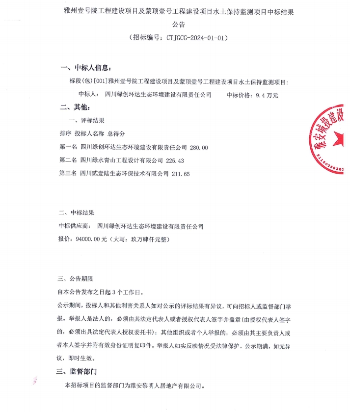 雅州壹號院工程建設項目及蒙頂壹號工程建設項目水土保持監(jiān)測項目中標結果公告