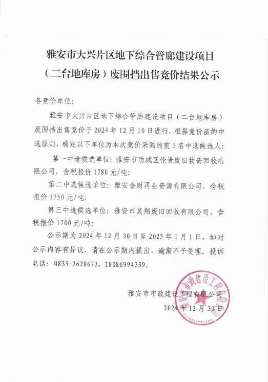 雅安市大興片區(qū)地下綜合管廊建設(shè)項目 (二臺地庫房)廢圍擋出售竟價結(jié)果公示