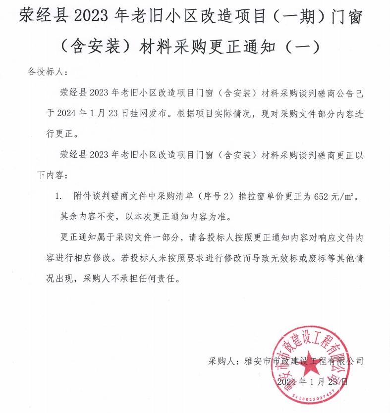 滎經(jīng)縣2023年老舊小區(qū)改造項(xiàng)目(一期)門(mén)窗(含安裝)材料采購(gòu)更正通知(一)