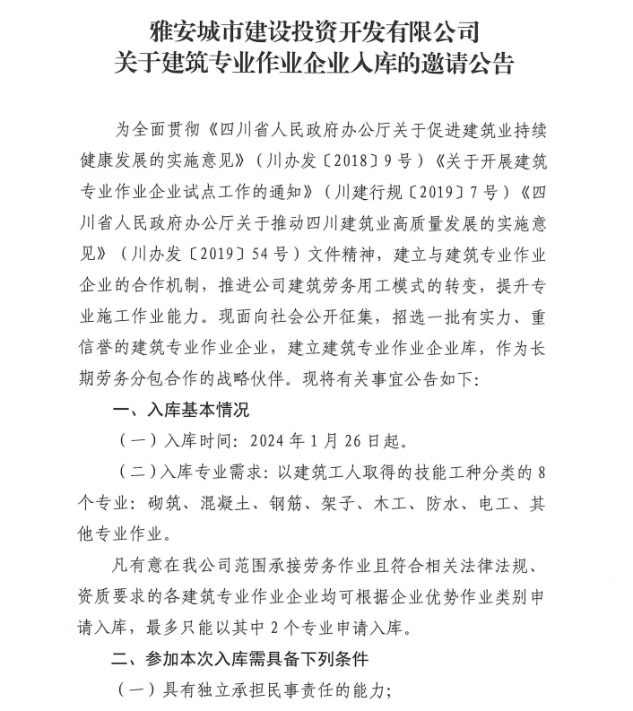 雅安城市建設(shè)投資開發(fā)有限公司關(guān)于建筑專業(yè)作業(yè)企業(yè)入庫的邀請公告
