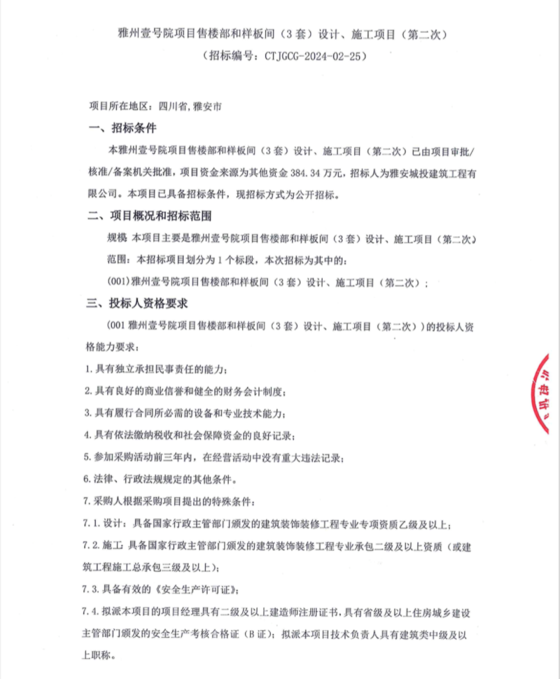 雅州壹號院項目售樓部和樣板間(3套)設(shè)計、施工項目(第二次)公告