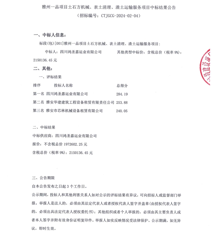 雅州一品項目土石方機械、表土清理、渣土運輸服務項目中標結(jié)果公告