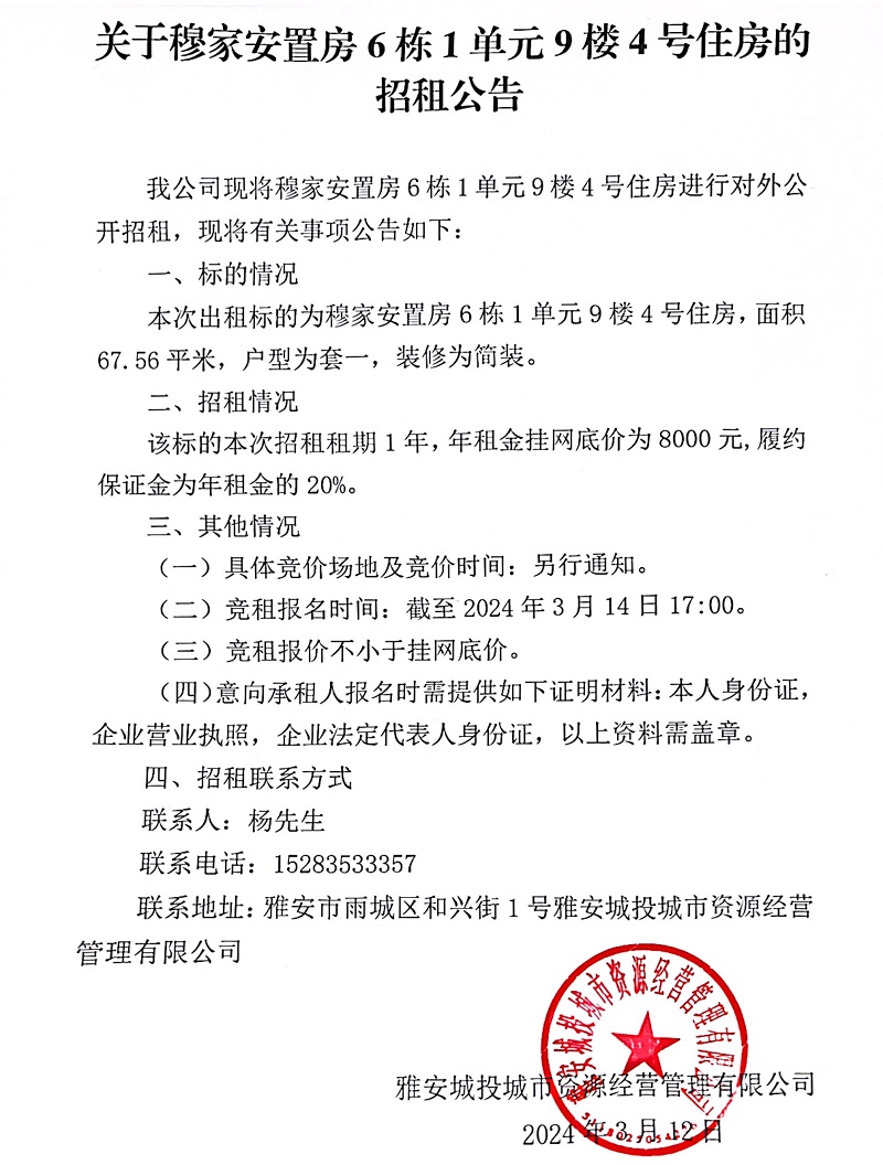 關(guān)于穆家安置房6棟1單元9樓4號(hào)住房招租的公告