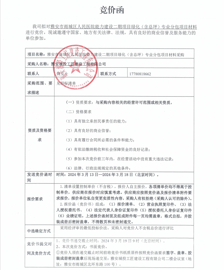 雅安市雨城區(qū)人民醫(yī)院能力建設(shè)二期項(xiàng)目綠化(含總坪)專業(yè)分包項(xiàng)目材料采購競價(jià)公告