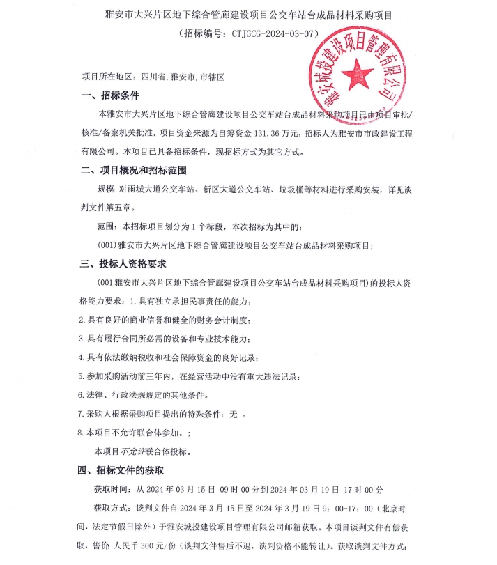 雅安市大興片區(qū)地下綜合管廊建設(shè)項(xiàng)目公交車站臺(tái)成品材料采購項(xiàng)目公告