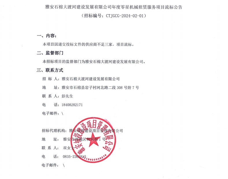 雅安石棉大渡河建設(shè)發(fā)展有限公司年度零星機(jī)械租賃服務(wù)項(xiàng)目流標(biāo)公告