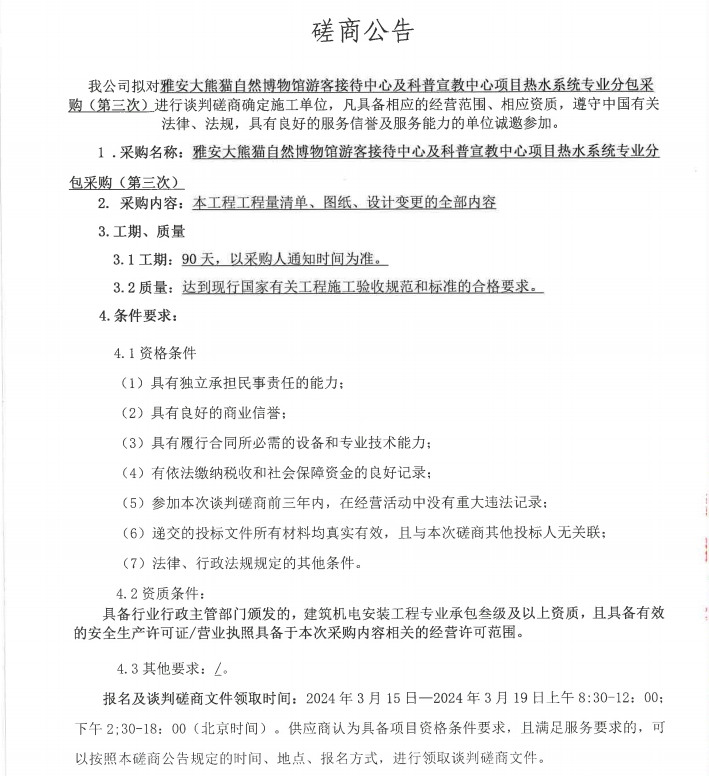 雅安大熊貓自然博物館游客接待中心及科普宣教中心項(xiàng)目熱水系統(tǒng)專業(yè)分包采購(第三次)磋商公告