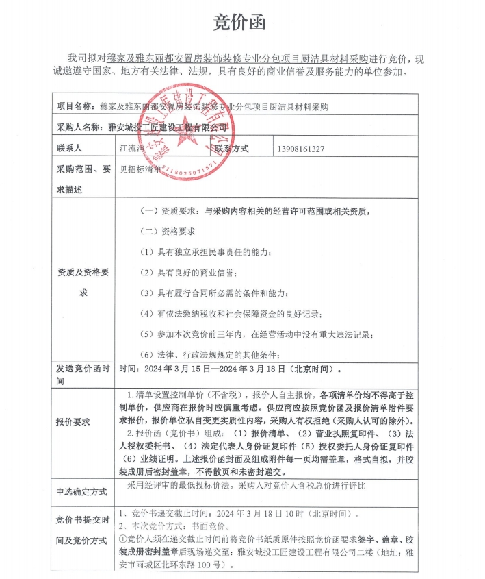 穆家及雅東麗都安置房裝飾裝修專業(yè)分包項目廚潔具材料采購競價公告