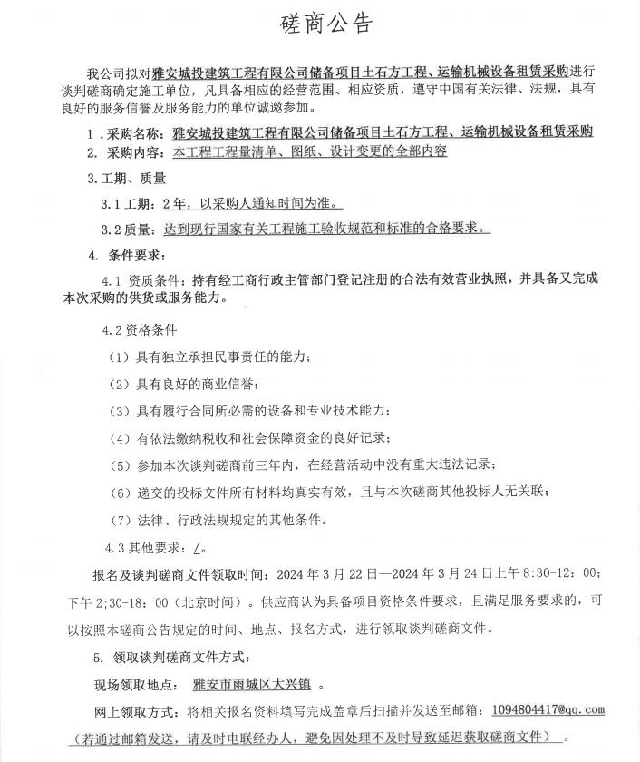 雅安城投建筑工程有限公司儲(chǔ)備項(xiàng)目土石工程、運(yùn)輸機(jī)械設(shè)備租賃采購磋商公告