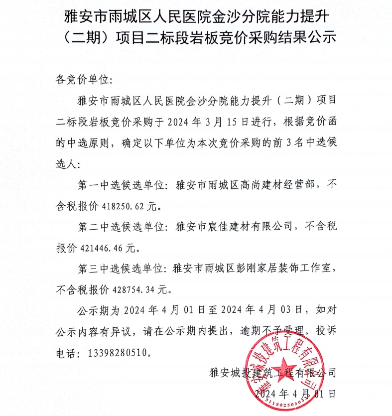 雅安市雨城區(qū)人民醫(yī)院金沙分院能力提升(二期)項(xiàng)目二標(biāo)段巖板競價(jià)采購結(jié)果公示