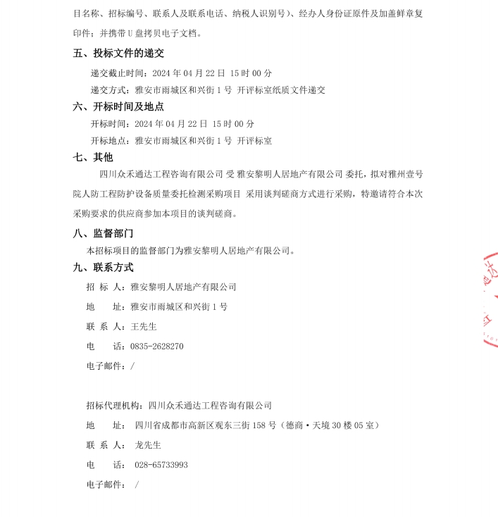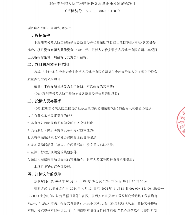雅州壹號院人防工程防護(hù)設(shè)備質(zhì)量委托檢測采購項目公告