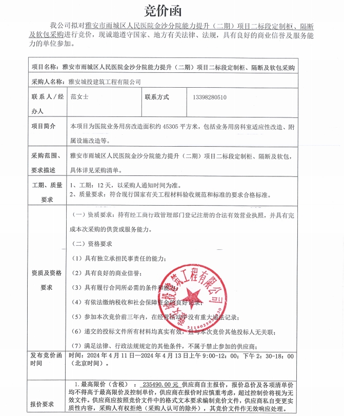 雅安市雨城人民醫(yī)院金沙分院能力提升(二期)項目二標段定制柜、隔斷及軟包采購競價公告