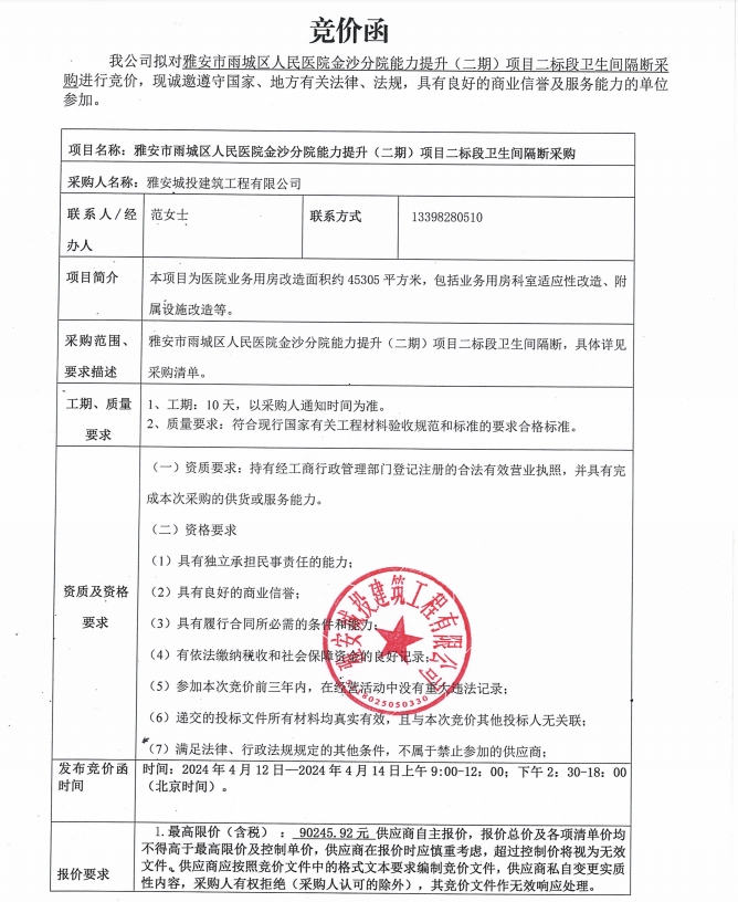 雅安市雨城區(qū)人民醫(yī)院金沙分院能力提升(二期)項目二標段衛(wèi)生間隔斷采購競價公告