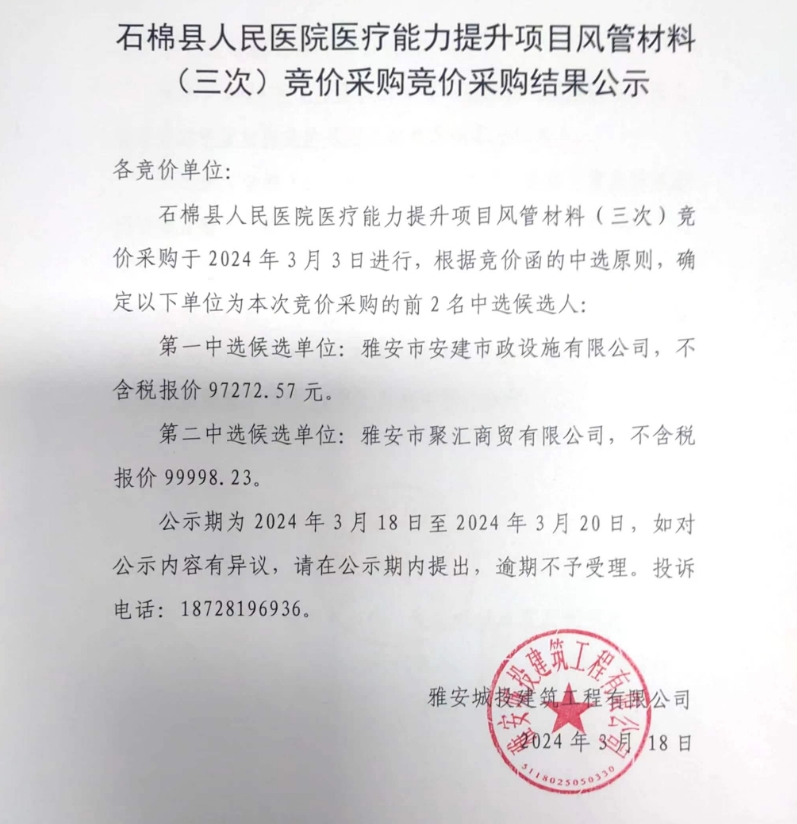 石棉縣人民醫(yī)院醫(yī)療能力提升項目風(fēng)管材料(三次)競價采購競價采購結(jié)果公示