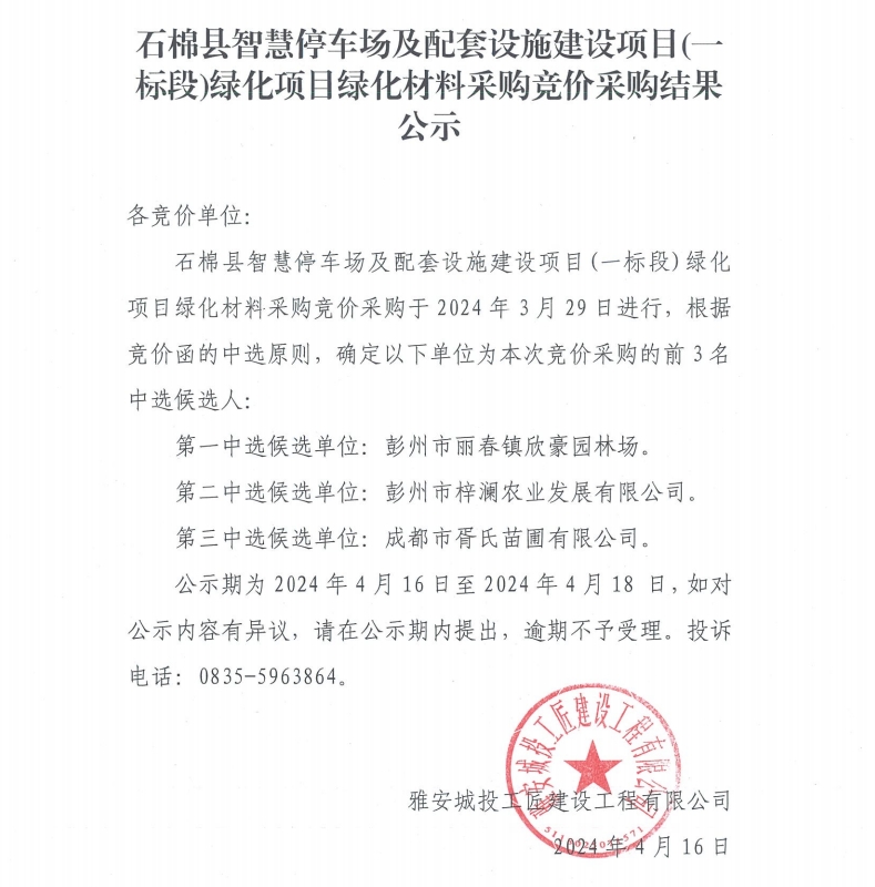 石棉縣智慧停車場及配套設(shè)施建設(shè)項目(一標(biāo)段)綠化項目綠化材料采購競價采購結(jié)果公示