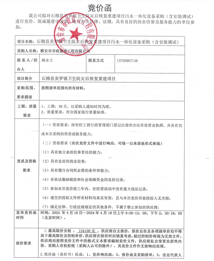 石棉縣美羅鎮(zhèn)衛(wèi)生院災(zāi)后恢復(fù)重建項目污水一體化設(shè)備材料采購(含安裝調(diào)試)競價公告