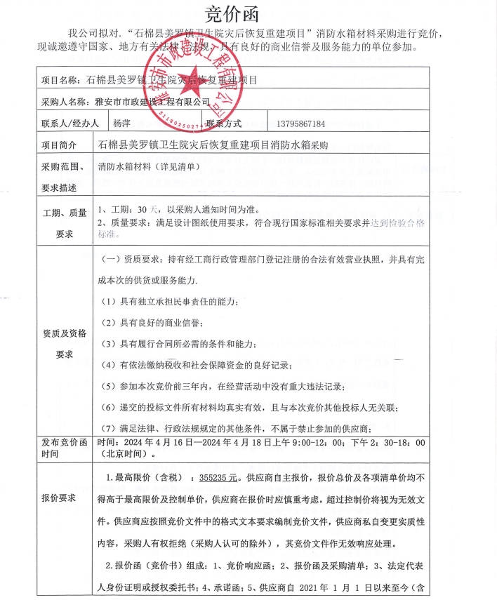 石棉縣美羅鎮(zhèn)衛(wèi)生院災(zāi)后恢復(fù)重建項目消防水箱材料采購競價公告
