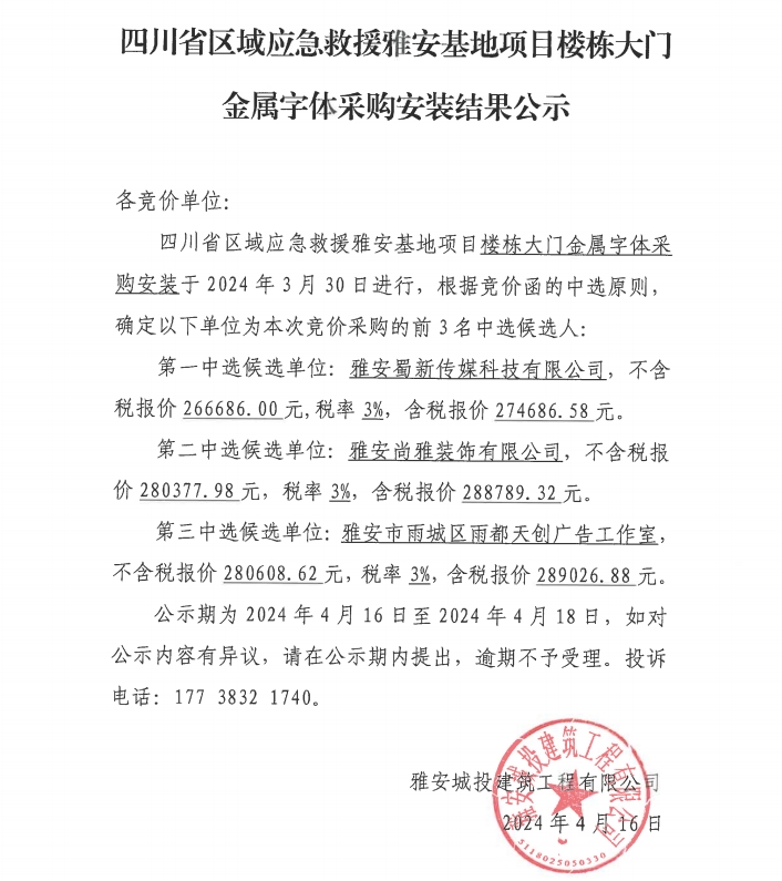 四川省區(qū)域應(yīng)急救援雅安基地項目樓棟大門金屬字體采購安裝結(jié)果公示