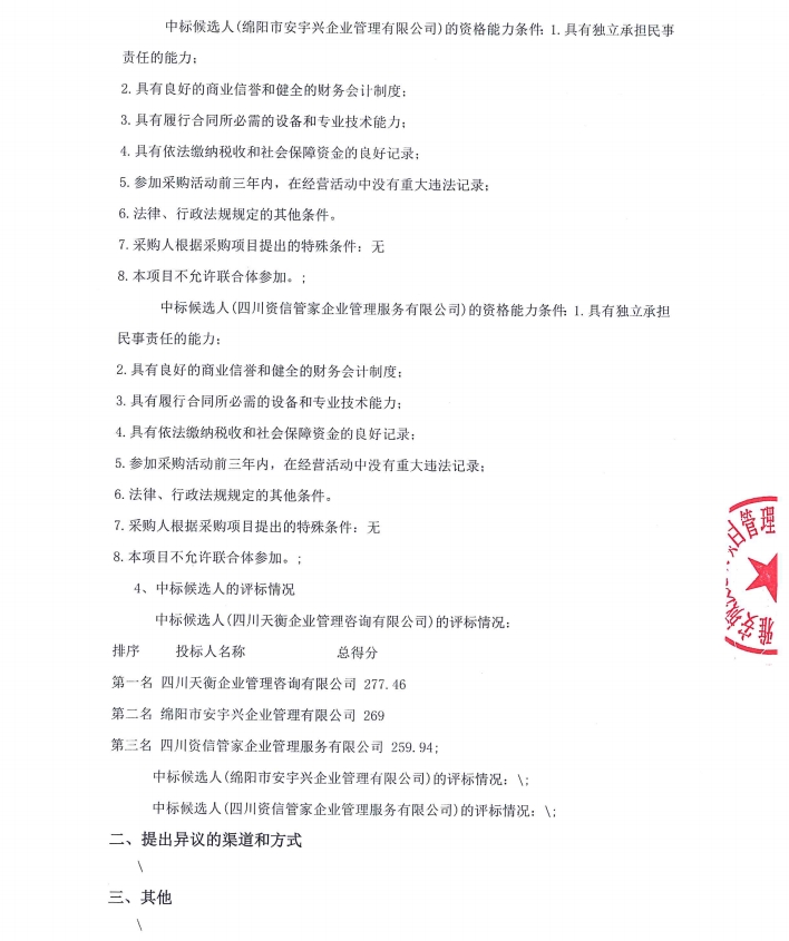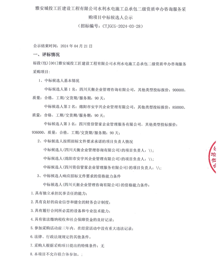 雅安城投工匠建設(shè)工程有限公司水利水電施工總承包二級(jí)資質(zhì)申辦咨詢服務(wù)采購項(xiàng)目中標(biāo)候選人公示