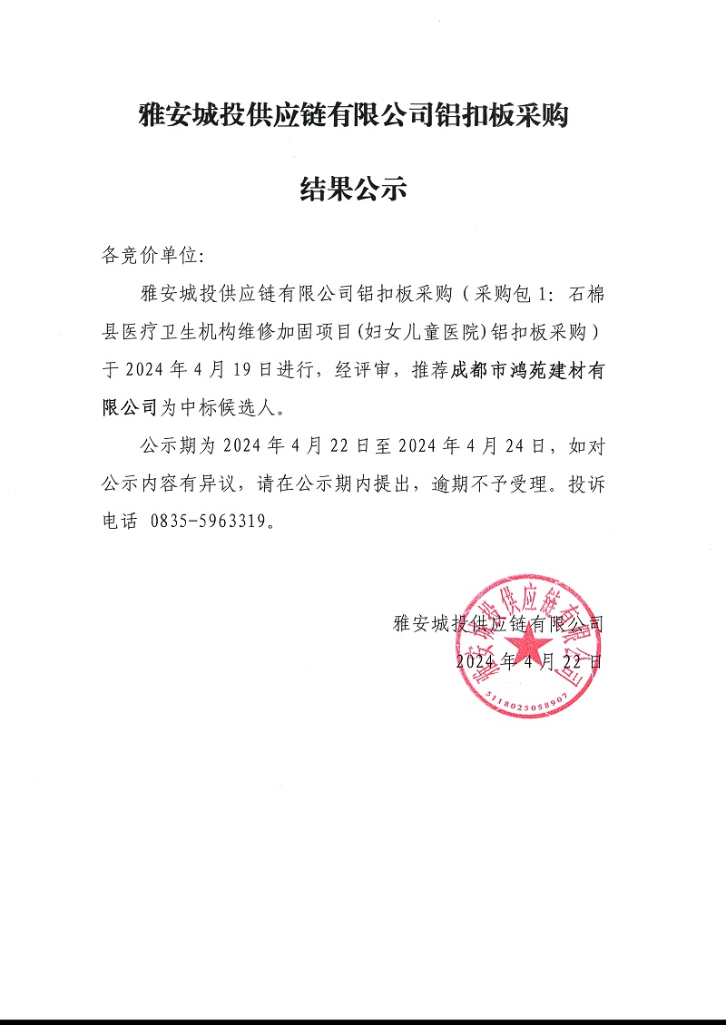雅安城投供應(yīng)鏈有限公司鋁扣板采購結(jié)果公示