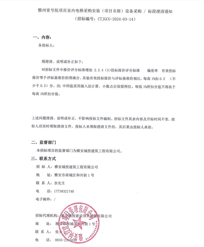 雅州壹號院項目室內(nèi)電梯采購安裝(項目名稱)設(shè)備采購/標(biāo)段澄清通知